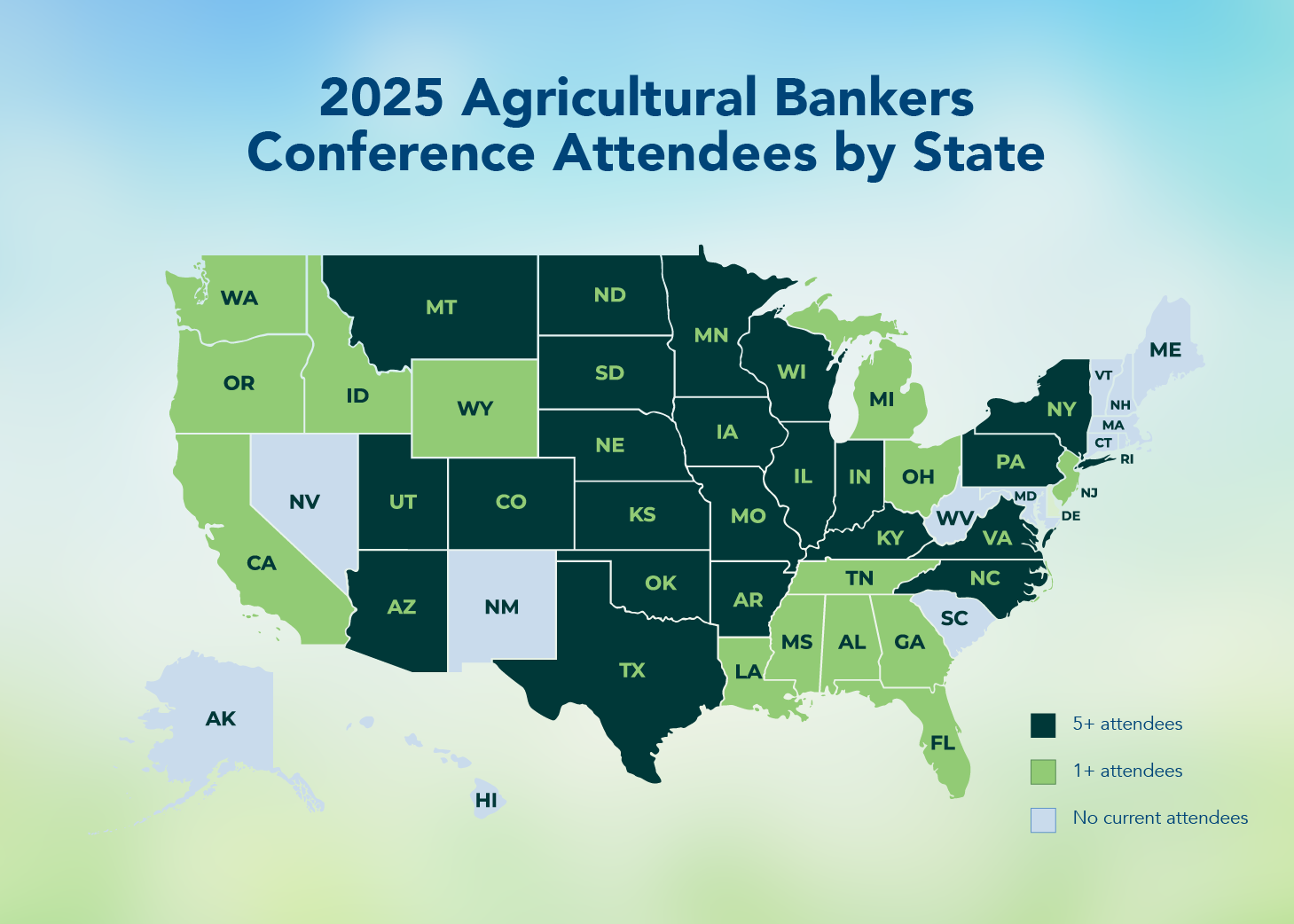 So far, attendees from 35 states have signed up for the 2025 Agricultural Bankers Conference—with more registering each day. Will you add your name to the list in 2026?