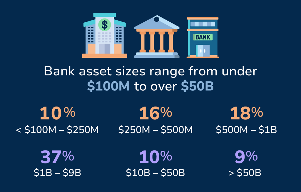 Bank asset sizes range from under $100M to over $50B: 9.51% <$100M - $250M; 15.73% $250M - $500M; 18.11% $500M - $1B; 37.14% $1B - $9B; 10.21% $10B - $50B; 9.29% >$50B.