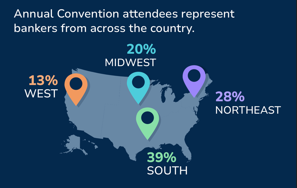 Annual Convention attendees represent bankers from across the country: 13% West; 20% Midwest; 28% Northeast; 39% South.